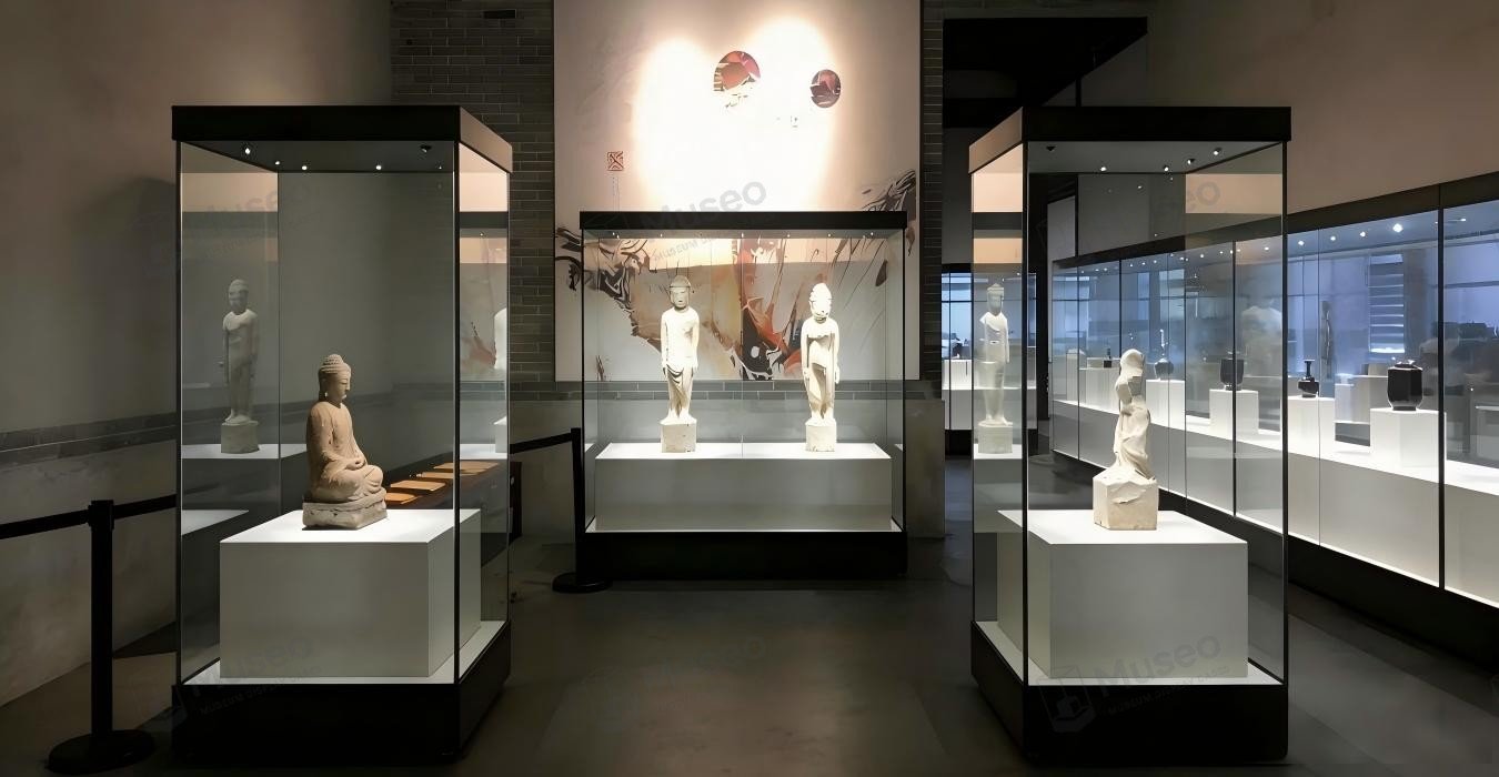 For statues, we have designed freestanding museum vitrine display case. The four transparent sides of these cases allow the low-reflection glass to almost “disappear,” creating an unobstructed visual connection between the viewer and the sculpture.