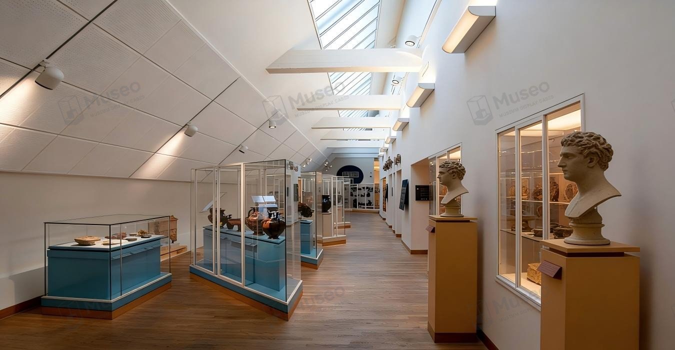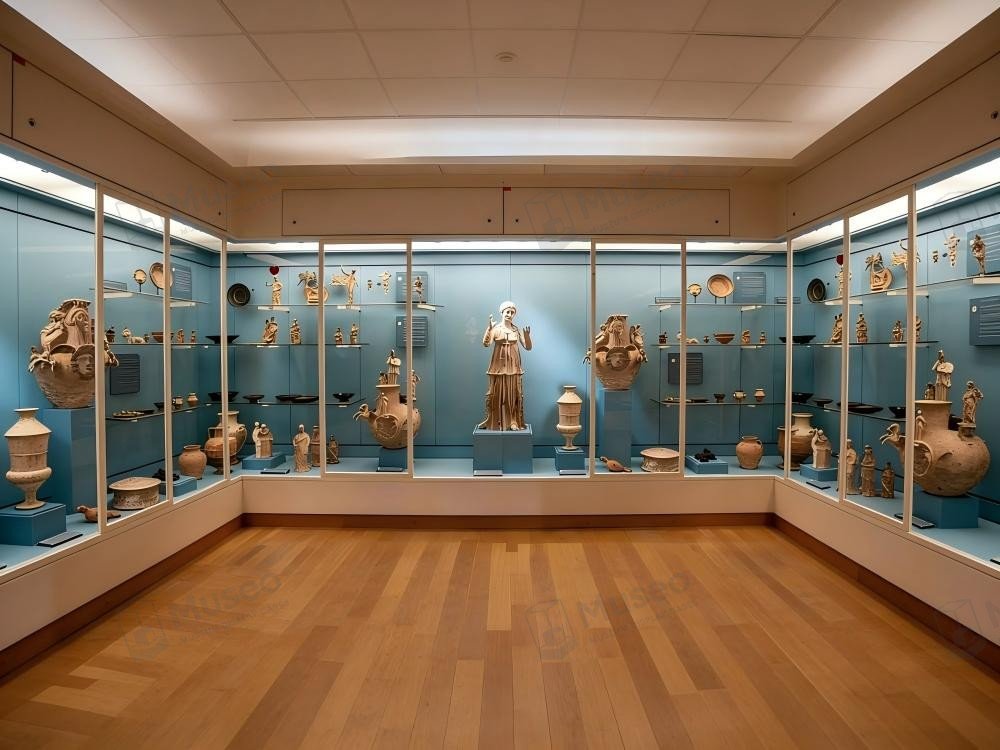 For ancient Greek pottery, we used independent glass museum style display case. With a three‑sided or fully glass design, visitors can observe the details of the pottery from multiple angles. The low‑reflective glass significantly reduces glare, allowing viewers to clearly appreciate the colours and decorative patterns of the artefacts.