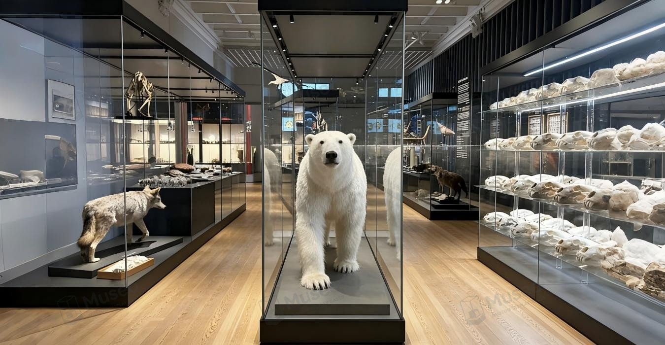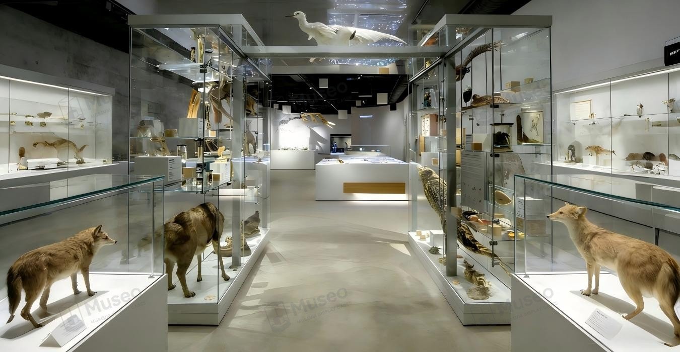 For animal specimens, we used independent panoramic tall museum style display case. Enclosed entirely with low‑reflective glass, they provide a 360° unobstructed view of the specimens, faithfully restoring the animals’ true forms. The sealed structure blocks dust, pests, and harmful gases, preventing contamination and corrosion of the specimens.