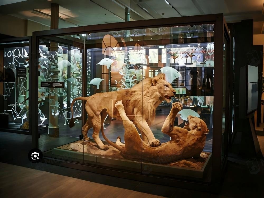 For taxidermy specimens, we adopted fully enclosed glass display cases. The fully enclosed cubic structure, made of high-strength low-reflection glass and a metal frame, offers a 360° unobstructed view, allowing visitors to observe the specimens from multiple angles. It also accommodates the dimensions of large specimens and meets the requirements of contextual display.