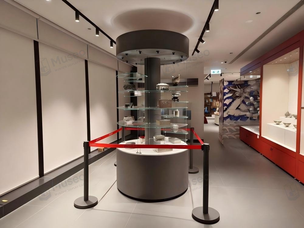 360-Degree Multi-Tiered Round Display Case: This freestanding case features a minimalist grey cylindrical design paired with multi-tiered transparent glass display shelves. It maximizes vertical space utilization while allowing visitors to walk around and appreciate exhibits on all levels from every angle—particularly suited for the concentrated display of multiple small artifacts or crafts.