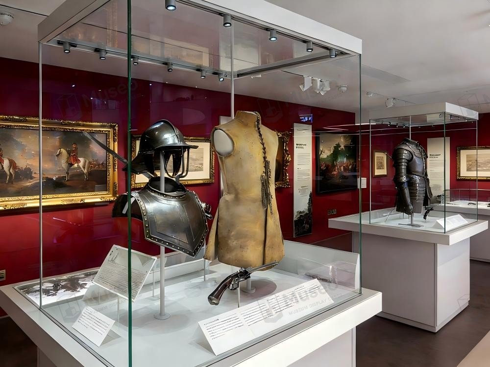 This is a custom-designed minimalist white freestanding display case. The cabinet features a pristine white base, enclosed by full-height, high-transparency anti-glare glass. Positioned independently within the exhibition hall, it aligns perfectly with the museum’s modern, minimalist exhibition style while allowing exhibits such as metal armor and weaponry to become the visual focal point.